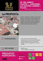 En què consisteix? Plantar, replantar o substituir els arbres petits o morts per tal d'aconseguir més ombres i més espais verds i amb flors. Analitzar de manera creativa espais no habituals on posar arbres, jardineres, jardins verticals, petits parterres.