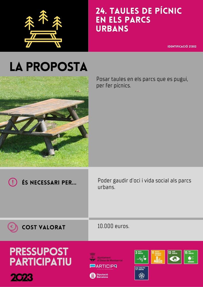 En què consisteix? Posar taules en els parcs que es pugui, per fer pícnics.