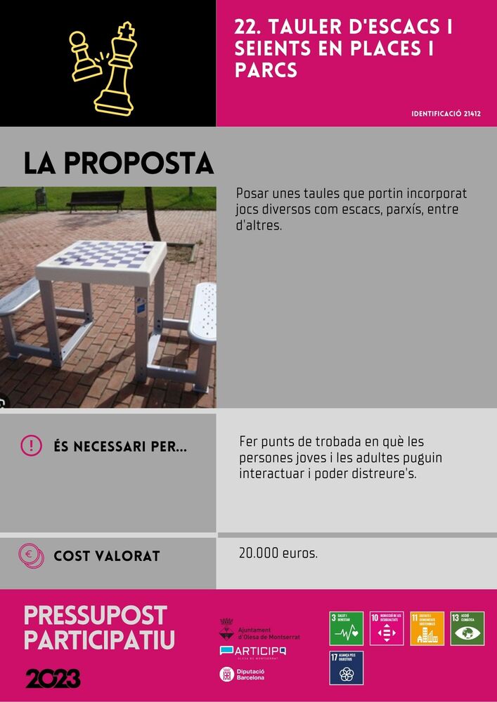 En què consisteix? Posar unes taules que portin incorporat jocs diversos com escacs, parxís, entre d'altres.