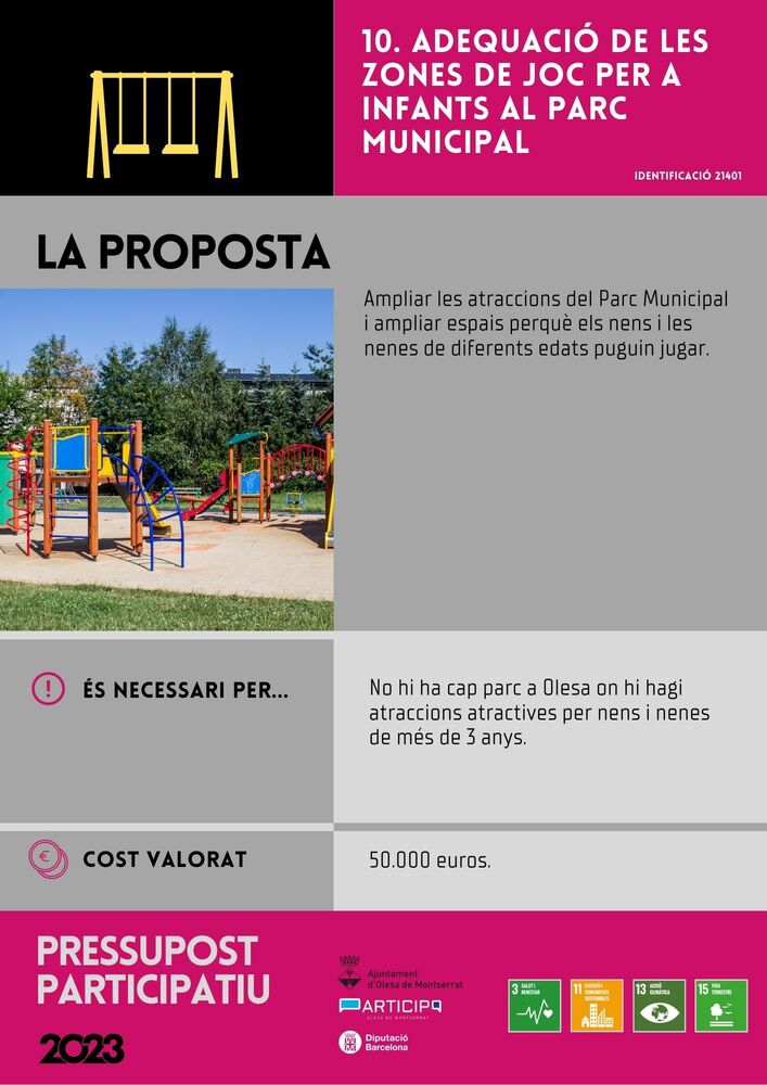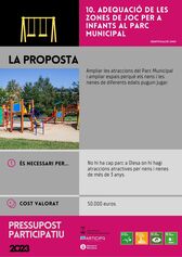 En què consisteix? Ampliar les atraccions del Parc Municipal i ampliar espais perquè els nens i les nenes de diferents edats puguin jugar.