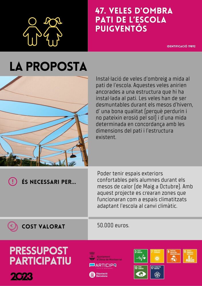 En què consisteix? Instal·lació de veles d'ombreig a mida al pati de l'escola. Aquestes veles anirien ancorades a una estructura que hi ha instal·lada al pati. Les veles han de ser desmuntables durant els mesos d'hivern, d' una bona qualitat (perquè perdurin i no pateixin erosió pel sol) i d'una mida determinada amb concordança amb les dimensions del pati i l'estructura existent.