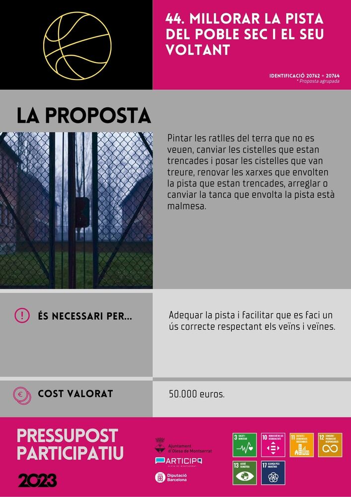 En què consisteix? Pintar les ratlles del terra que no es veuen, canviar les cistelles que estan trencades i posar les cistelles que van treure, renovar les xarxes que envolten la pista que estan trencades, arreglar o canviar la tanca que envolta la pista està malmesa.
