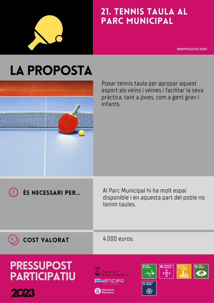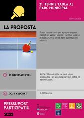 En què consisteix? Posar tennis taula per apropar aquest esport als veïns i veïnes i facilitar la seva pràctica, tant a joves, com a gent gran i infants.