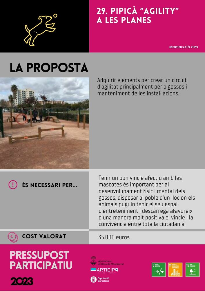 En què consisteix? Adquirir elements per crear un circuit d'agilitat principalment per gossos i manteniment de les instal·lacions.