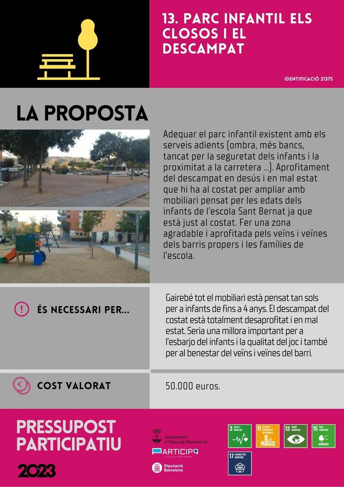 En què consisteix? Adequar el parc infantil existent amb els serveis adients (ombra, més bancs, tancat per la seguretat dels infants i la proximitat a la carretera ...). Aprofitament del descampat en desús i en mal estat que hi ha al costat per ampliar amb mobiliari pensat per les edats dels infants de l`escola Sant Bernat ja que està just al costat. Fer una zona agradable i aprofitada pels veïns i veïnes dels barris propers i les famílies de l’escola.