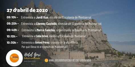 Amb motiu de la festivitat de la Mare de Déu de Montserrat, Olesa Ràdio realitza, al seu magazín "Hotel Gori, entrevistes a diversos protagonistes per saber com és la vida a Montserrat. https://www.olesademontserrat.cat/olesaradio/pl11/radio-a-la-carta/id13315/hotel-gori-2742020-programa-especial-dedicat-a-montserrat-olesa.htm?fbclid=IwAR3G2LxXE1nhom-IuC1QPmPF8Ak52tNTKT6FRdJjCp-o0CuOXByUHvaZxGI