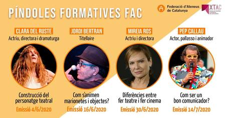 Des de la Federació d'Ateneus de Catalunya (FAC) i la Xarxa Teatres d'Ateneus de Catalunya (XTAC) s'organitza un cicle de píndoles formatives. Clara del Ruste - Construcció d'un personatge teatral - 4/06/2020 Jordi Bertran - Com s'animen Marionetes i objectes? - 16/06/2020 Mireia Ros - Diferències entre fer teatre i fer cinema - 30/06/2020 Pep Callau - Com ser un bon comunicador? - 14/07/2020