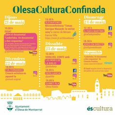 Aquest cap de setmana es podrà gaudir de nou del cicle Olesa Cultura Confinada a través de les xarxes socials. La 6a edició l arriba amb noves propostes divulgatives, teatrals i musicals d’olesans i olesanes, dirigides a tots els públics. Entrevista a Xavier Rota, regidor de Cultura i Joventut, 6è Olesa Cultura Confinada https://bit.ly/2LHWW9U